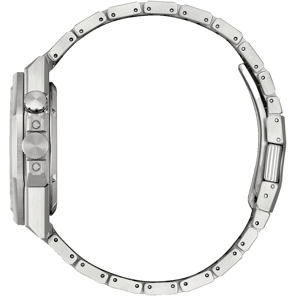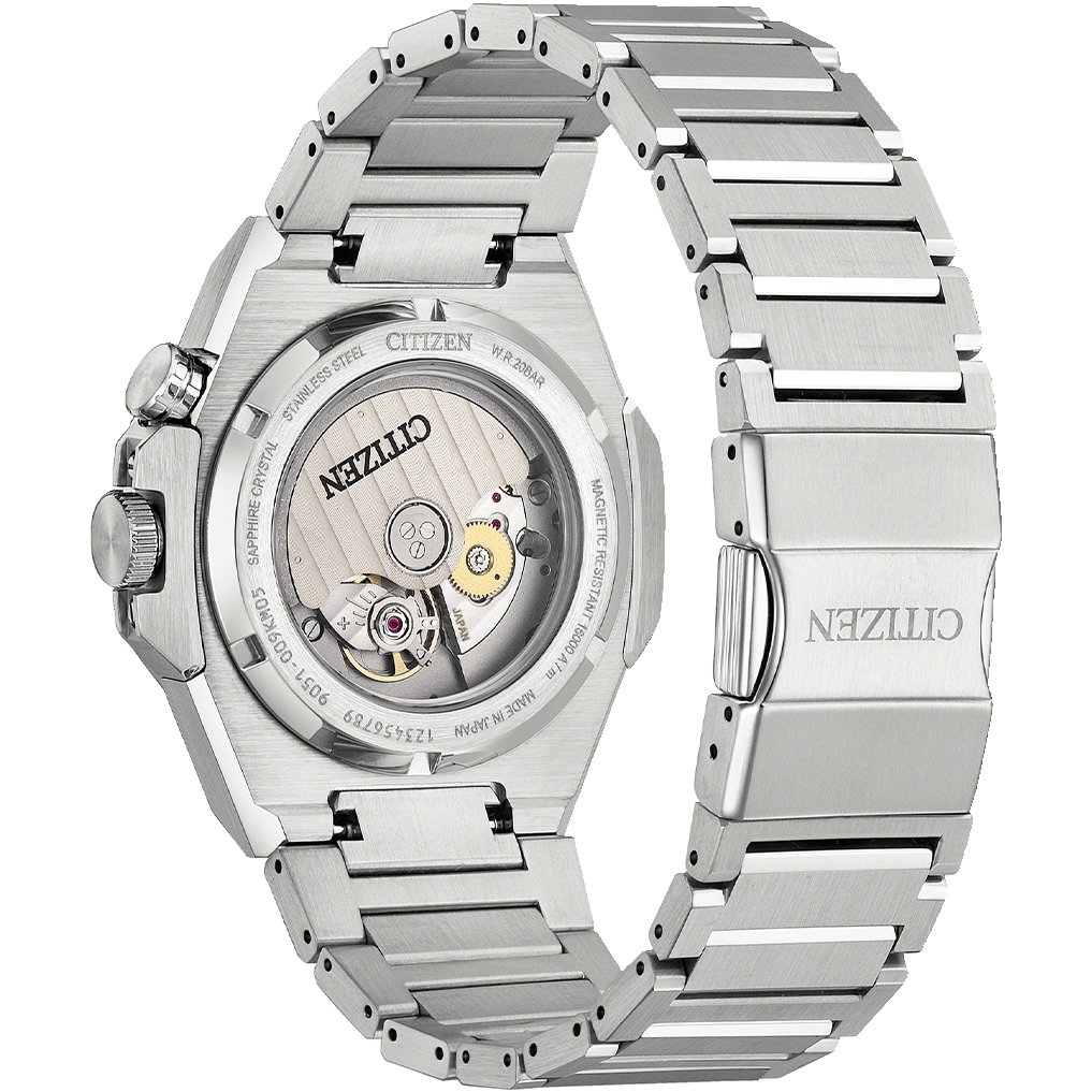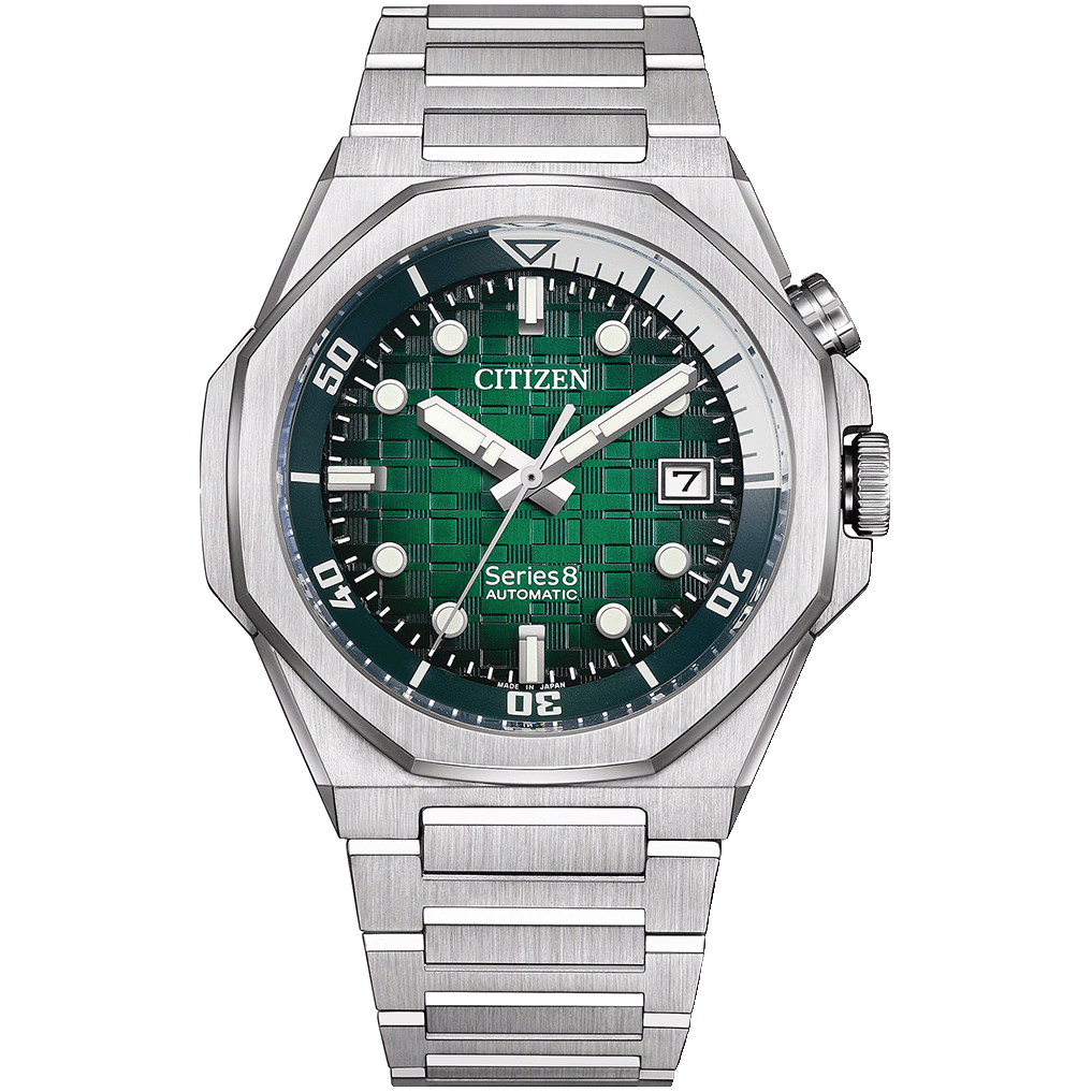 Balancing the worlds of robust wear and refined styling, the new Series 8 890 features a 42.6mm octagonal silver-tone stainless steel case alongside the best of the Citizen's finishing techniques. Water resistant to 200m and able to withstand magnetic fields up to 16,000 A/m, the watch is powered by the high-performance Calibre 9051. The automatic movement is visible through a sapphire exhibition case back and is capable of maintaining an accuracy of +20 / -10 seconds per day with a frequency of 28,800 v/h. Taken as a whole, the timepiece's superior technical performance perfectly matches it's sports-driven style.With its tapered, integrated silver-tone stainless steel H-link bracelet and double set of crowns, the watch is ready for wear in any instance. Underneath a sapphire crystal, a textured green dial with a rotating inner dive bezel is as captivating as it is practical, being highly legible on account of its applied indices and the smart design of it's hands. The crown at 2 o’clock controls the bi-directional rotating inner dive bezel that adds contrast alongside other details, with the highly-legible dial playing wonderfully in the light while a 3 o'clock date window adds even more utility to the design.