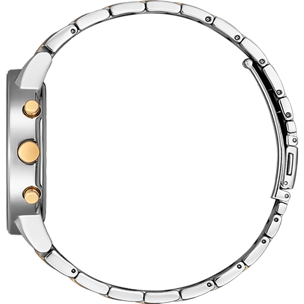 The refined yet sleek design of this Citizen Eco-Drive offers a day-to-night fashion options for the avid trendsetter. This sharp chronograph is featured in a stainless steel case and bracelet with a black dial and the intriguing feature of edge-to-edge glass. Also includes a 1-second chronograph measuring up to 60 minutes, 12/24-hour time and reverse date window. Powered by Eco-Drive- the revolutionary light powered movement from Citizen, this watch has the ability to continuously recharge in any light source and can run for a minimum of six months even in the dark without any charge. This revolutionary earth-friendly technology eliminates the need to change battery frequently and gives you hassle-free timekeeping, never disappointing you when you need it the most. The Eco-Drive movement also come with built-in Insufficient Charge Warning Function and Overcharge Prevention Function
