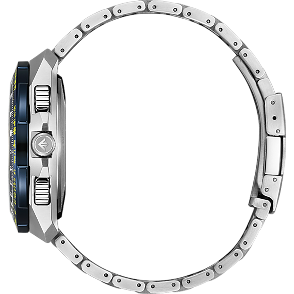 The mission of the Blue Angels is to showcase the pride and professionalism of the U.S. Navy and Marine Corps through their expert precision and dedication to excellence and service. This exceptional timepiece has a silver-tone stainless steel case with a blue ion-plated bezel, yellow inner bezel, and blue dial encased in sapphire crystal. It features atomic time clock synchronization for superior accuracy, time adjustment available in 43 world cities, a 1/100 second chronograph that measures up to 24 hours, a perpetual calendar, 2 alarms, 99-minute countdown timer, digital backlight display, Universal Coordinated Time (UTC) display, and a power reserve indicator. The silver-tone stainless steel bracelet band fastens with a fold over clasp with hidden push buttons. The Blue Angel's insignia is replicated on the case back. This distinctive sports watch utilizes our Eco-Drive technology that’s sustainably powered by light and never needs a battery, and is water resistant up to 200 meters. Reach a higher altitude in style and pay tribute to the elite Blue Angels with this high-performance timepiece.